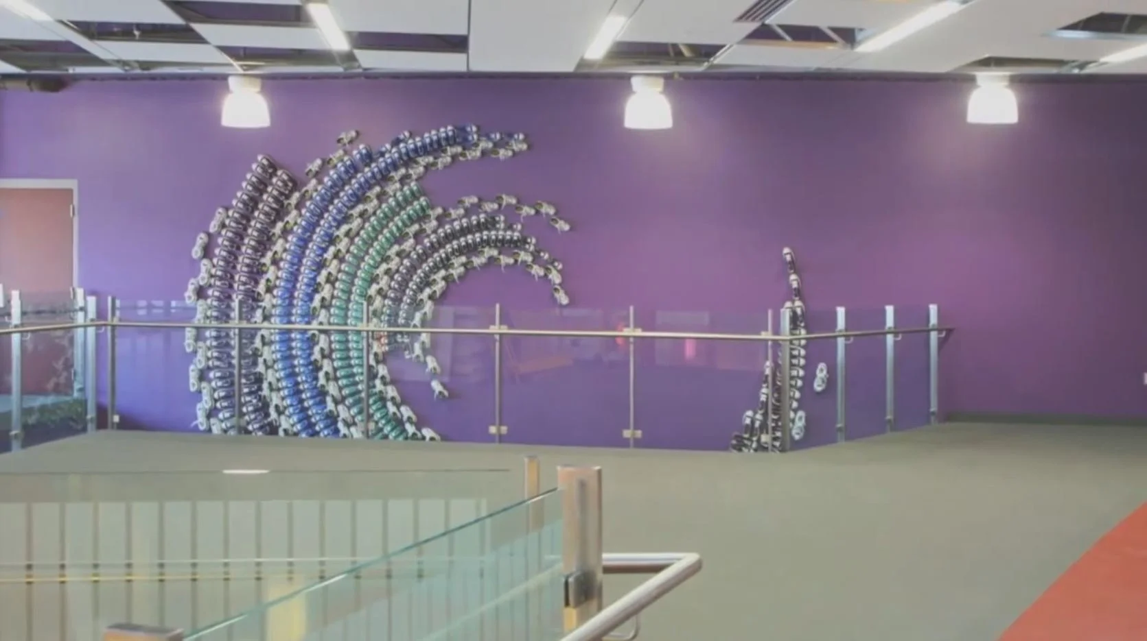 Milling Around is a two-story wall installation made up of hundreds of athletic shoes. The shoes are a nod to the functions of the building (a basketball court and jogging track), and the shape refers to the grinding circular mill stones that were part of the site over a hundred years ago.